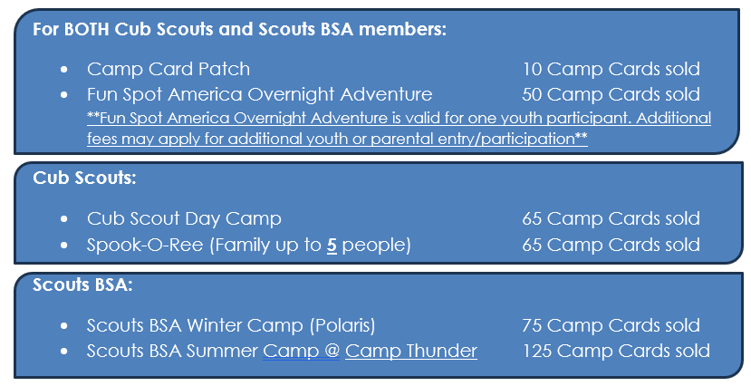 The purpose of selling Camp Cards is to allow Scouts to earn money towards their Scouting program. This could be for unit campouts, a new uniform, annual registration or unit fees, activities, summer camp, or more. Even if your unit hasn’t decided yet or is not interested in managing the sale for your families, you can still participate!