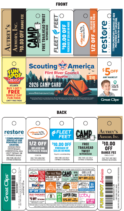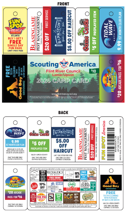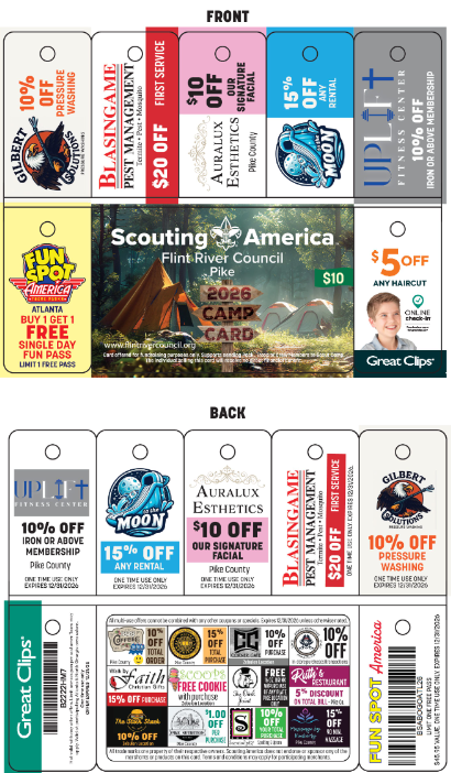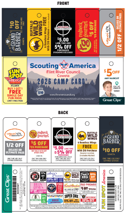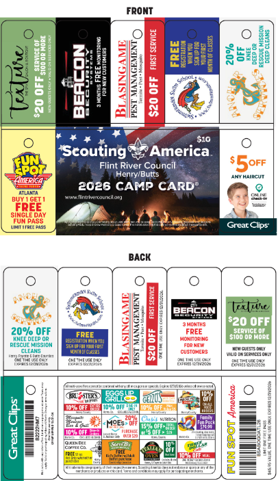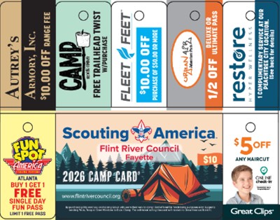 The Flint River Council is pleased to announce the return of our Council-wide Camp Card Sale for 2026. Scouts/Units have been very successful selling these cards. Through partnerships with local businesses, this year's Camp Cards are a phenomenal value. Some Scouts have reported they were able to earn enough to cover registration and camp fees for the entire year. We hope that every Scout and unit will take advantage of this opportunity to pay their own way through their scouting career.